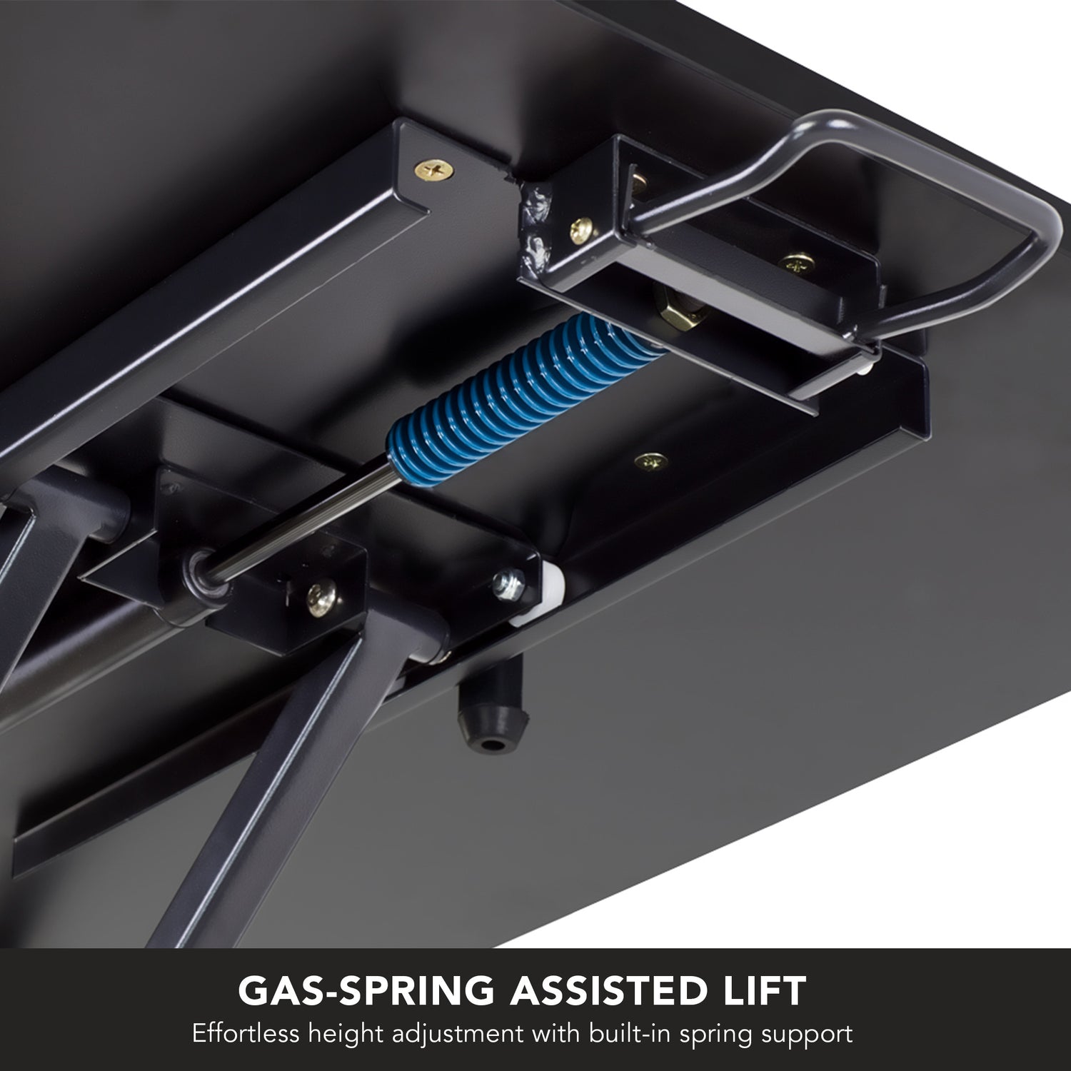 This sit-stand desk converter elevates your computer or laptop to a comfortable height for an improved viewing experience and better posture. The spacious tabletop on this converter supports a monitor and a laptop or tablet. Moving from sitting to standing can be done in a matter of seconds thanks to the spring mechanism built into this design. Simply squeeze the lever on the side of the desk, and the desk will raise and lower in a smooth, fluid motion. Ready to use right out of the box.