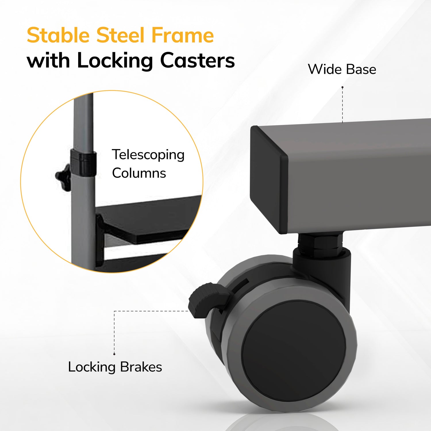 This sleek workstation is made with a high-quality steel frame and is carefully designed with platforms that provide plenty of space for monitors, keyboards, a mouse pad, a PC tower and a printer. Use with or without the included monitor arm for an ergonomic layout. The locking casters allow the cart to be stationary or mobile when you need it to be, and 17" of height adjustment supports sitting and standing at 11 locking intervals.