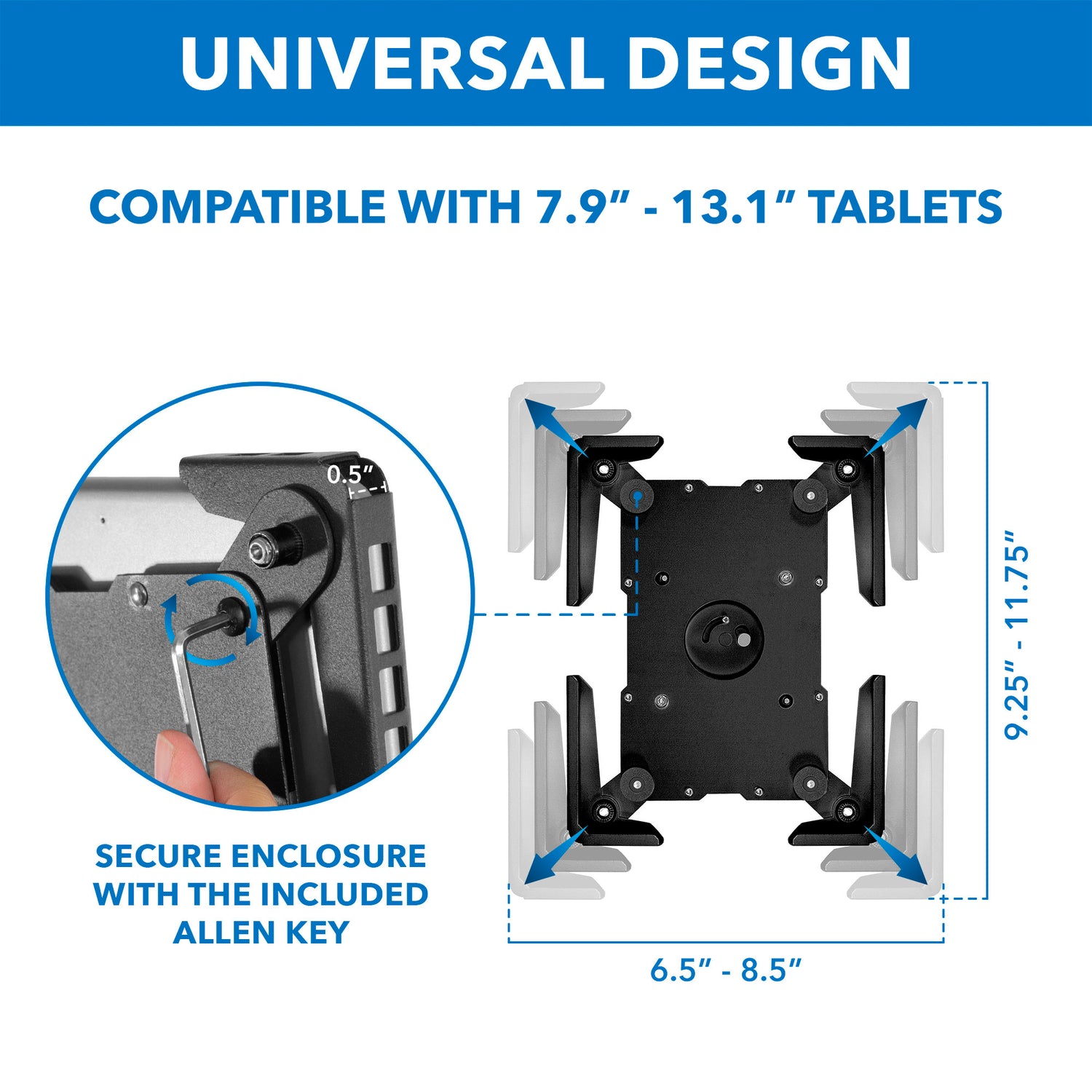 Enclosure is compatible with most 9.7" - 13.1" tablets